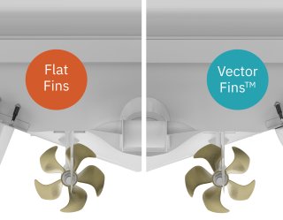 2.3.2023Den vertikale konkave formen til Vector-finnen skaper en netto-kraftretning, både under fart og når båten ligger oppankret. Dette gjør at finnene jobber mer "opp/ned", i motsetning til flate finner som jobber med krefter parallelt med skrogvinkelen.